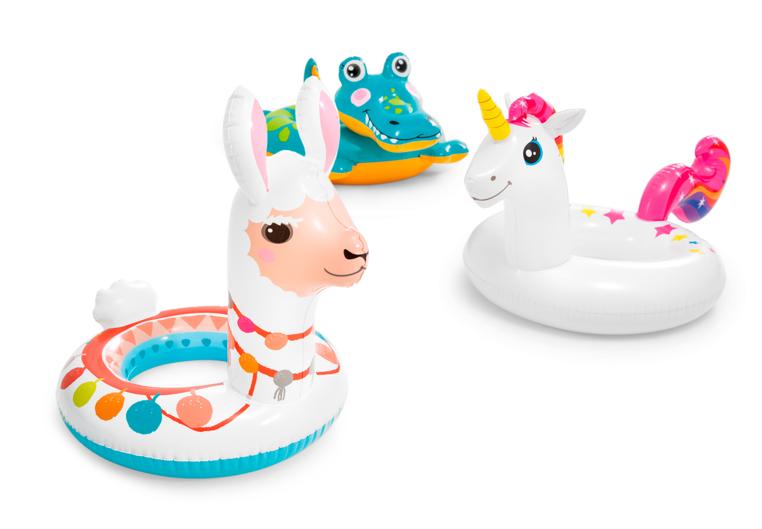 / 58221 Intex Inflatable Deluxe Flamingo Swim Ring – Blue 1.07m x 58cm (Unicorn), 86cm x 58cm (Llama), 81cm x 58cm (Dinosaur)